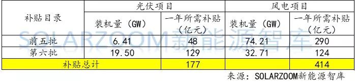 進(jìn)入前六批可再生能源補(bǔ)貼目錄的電站項(xiàng)目中,風(fēng)力發(fā)電項(xiàng)目和光伏發(fā)電項(xiàng)目裝機(jī)量占比超過95%,因此記者在可再生能源補(bǔ)貼測算中不涵蓋生物質(zhì)能和地?zé)崮艿妊a(bǔ)貼測算。經(jīng)測算,目前涵蓋在以發(fā)放的前六批可再生能源補(bǔ)貼目錄中,光伏項(xiàng)目每年所需要的補(bǔ)貼為177億元,風(fēng)電每年所需要的補(bǔ)貼為414億元。