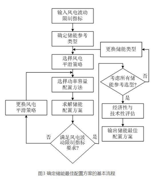 綜合儲(chǔ)能系統(tǒng)的類型選取、風(fēng)電平滑策略及功率容量配置方法,本文提出一種確定儲(chǔ)能最佳配置方案的方法,如圖3所示。