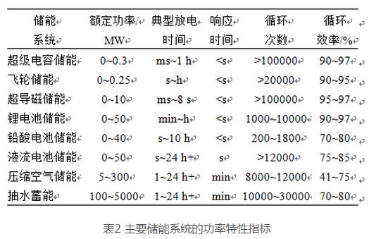 目前,不同國(guó)家多采用給定時(shí)間尺度風(fēng)電功率最大波動(dòng)量,作為風(fēng)電波動(dòng)限制指標(biāo)。該指標(biāo)的時(shí)間尺度和波動(dòng)幅值分別對(duì)儲(chǔ)能系統(tǒng)的功率特性和存儲(chǔ)容量提出了要求。因此,儲(chǔ)能系統(tǒng)的類型選取應(yīng)重點(diǎn)關(guān)注儲(chǔ)能系統(tǒng)的功率特性。表2給出了主要儲(chǔ)能系統(tǒng)的功率特性指標(biāo)。