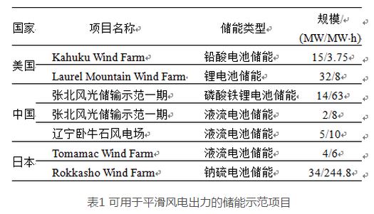 上述示范項(xiàng)目的應(yīng)用模式主要包括:促進(jìn)集中式風(fēng)電、光伏接入電網(wǎng),提高輸配電及用電側(cè)可靠性,提升分布式發(fā)電或微電網(wǎng)運(yùn)行能力,以及提供電網(wǎng)輔助服務(wù)。表1列出了國(guó)內(nèi)外典型的可用于平滑風(fēng)電出力的儲(chǔ)能示范項(xiàng)目。由表1可知,示范項(xiàng)目的儲(chǔ)能系統(tǒng)多為電池儲(chǔ)能。這主要由于,電池儲(chǔ)能布點(diǎn)靈活且具有較快的響應(yīng)速度及較高的能量密度,既可平滑風(fēng)電出力,也可實(shí)現(xiàn)緩解棄風(fēng)、參與調(diào)峰、提供備用等功能。