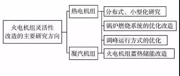 火電機組靈活性改造的研究方向:火電機組分為熱電機組和凝汽機組兩大類,歐美多數(shù)廣泛使用熱電聯(lián)產(chǎn)機組,但其中較大比重為大容量抽凝式機組;國內(nèi)兩類機組都普遍存在,熱電機組裝機容量大約為火電總裝機容量的32%?;痣姍C組靈活性主要包括機組的調(diào)峰深度,爬坡能力和啟停速度等內(nèi)容,改造主要的研究方向如圖1所示。調(diào)峰運行方式的優(yōu)化和鍋爐燃燒系統(tǒng)的優(yōu)化改造是火電機組靈活性改造的主要手段。