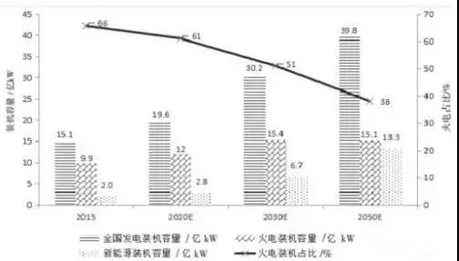據(jù)中國電力企業(yè)聯(lián)合會預測, 2020年、2030年、2050年是我國火電產(chǎn)業(yè)發(fā)展的重要節(jié)點,未來我國火電產(chǎn)業(yè)將進入衰退期。2020年, 火電裝機容量占總裝機容量61%, 2030年下降到51%, 到2050年進一步下降至38%,而新能源裝機占比持續(xù)上升, 到2050年, 新能源裝機占比已上升至33%?;痣娧b機容量一路下行的數(shù)據(jù)拐點,無情地證明了火電產(chǎn)業(yè)規(guī)模逐年遞減。