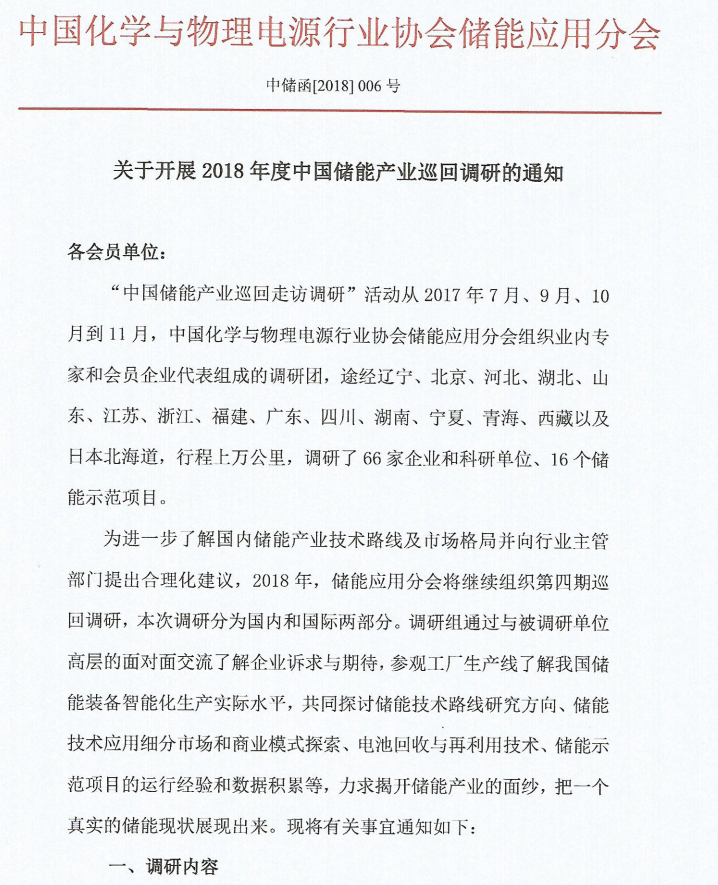 關(guān)于開展2018年度中國儲能產(chǎn)業(yè)巡回調(diào)研的通知