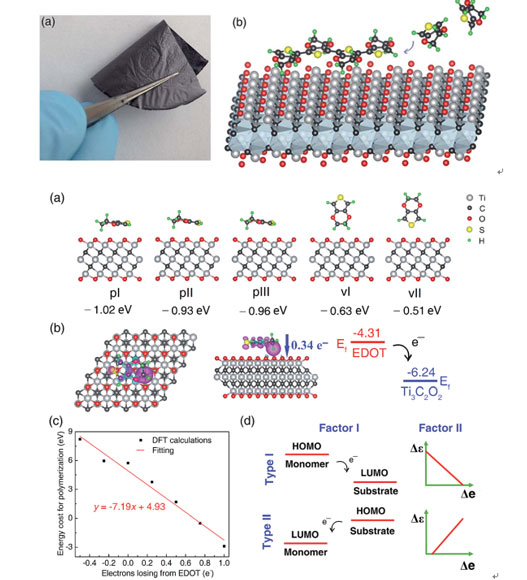 MXene材料表面特性對其電化學(xué)性能至關(guān)重要。華中科技大學(xué)光學(xué)與電子信息學(xué)院江建軍教授團隊與德雷塞爾大學(xué)Yury Gogotsi教授團隊合作,研究了限制在二維MXene Ti 3 C 2 T x層間的電荷轉(zhuǎn)移引起的EDOT聚合效應(yīng),在不使用任何氧化劑情況下在Ti 3 C 2 T x MXene的表面上實現(xiàn)3,4-亞乙基二氧噻吩(EDOT)的原位聚合,顯著改進了Ti 3 C 2 T x /poly-EDOT復(fù)合物的鋰離子儲存能力。并結(jié)合實驗和理論研究揭示了EDOT電荷轉(zhuǎn)移誘導(dǎo)聚合的機理,該機理可以擴展到其他類似的聚合物對MXene二維材料表面改性研究。