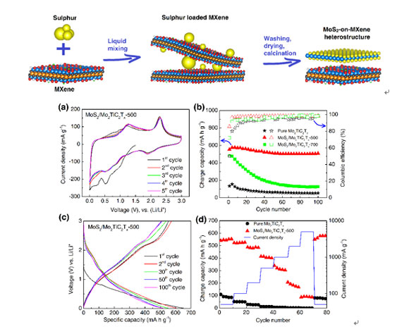 圖2MXene/MoS2異質(zhì)結(jié)構(gòu)合成示意圖及鋰離子存儲特性