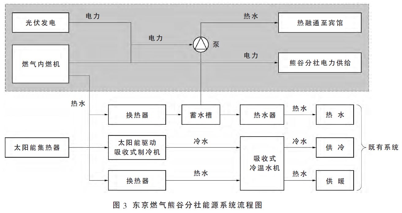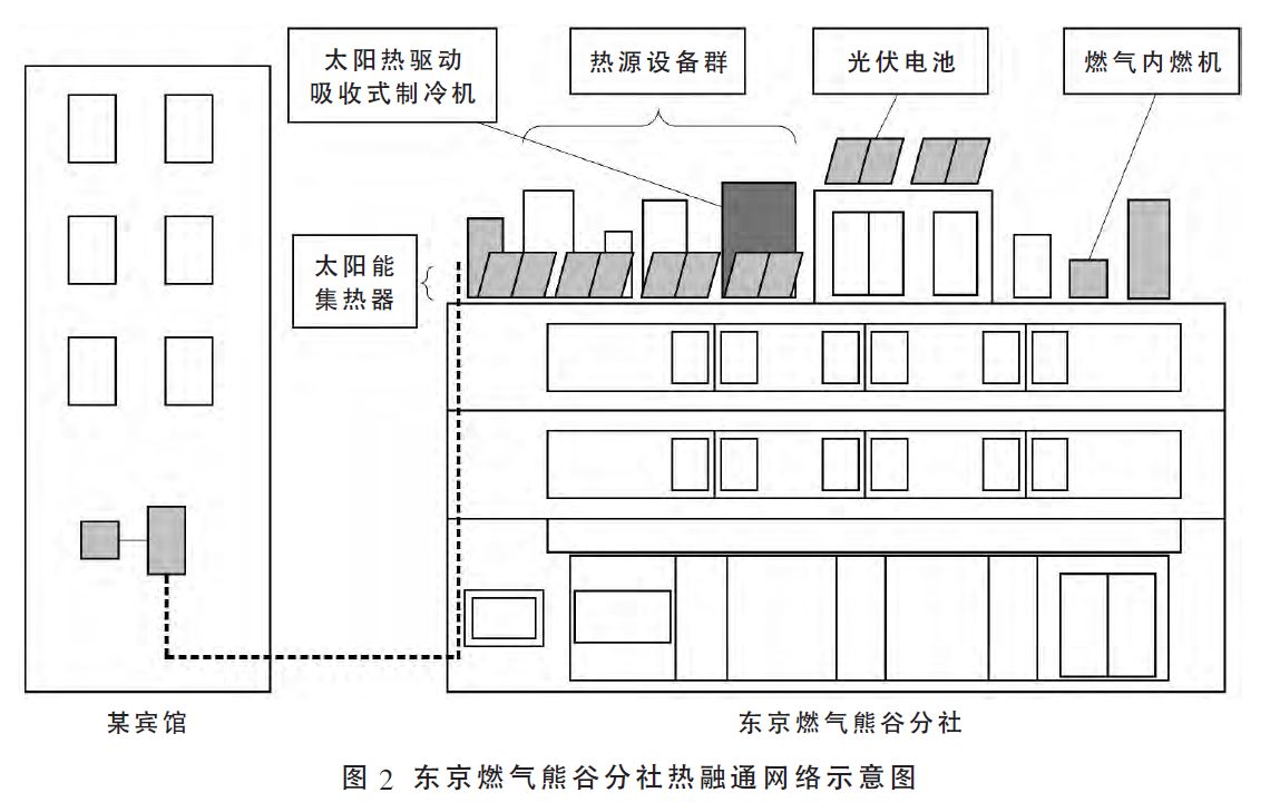 根據(jù)日本于2008年修正的節(jié)能法,2000m2以下中小規(guī)模樓宇需要進行節(jié)能改造。在此背景下,東京燃氣熊谷分社(建于1984年,建筑面積1400m2)和相鄰的賓館(建于1986年,建筑面積為8940m2)于2009年進行了協(xié)同節(jié)能改造,通過構建熱融通系統(tǒng),確立了新型能源面域利用模式。