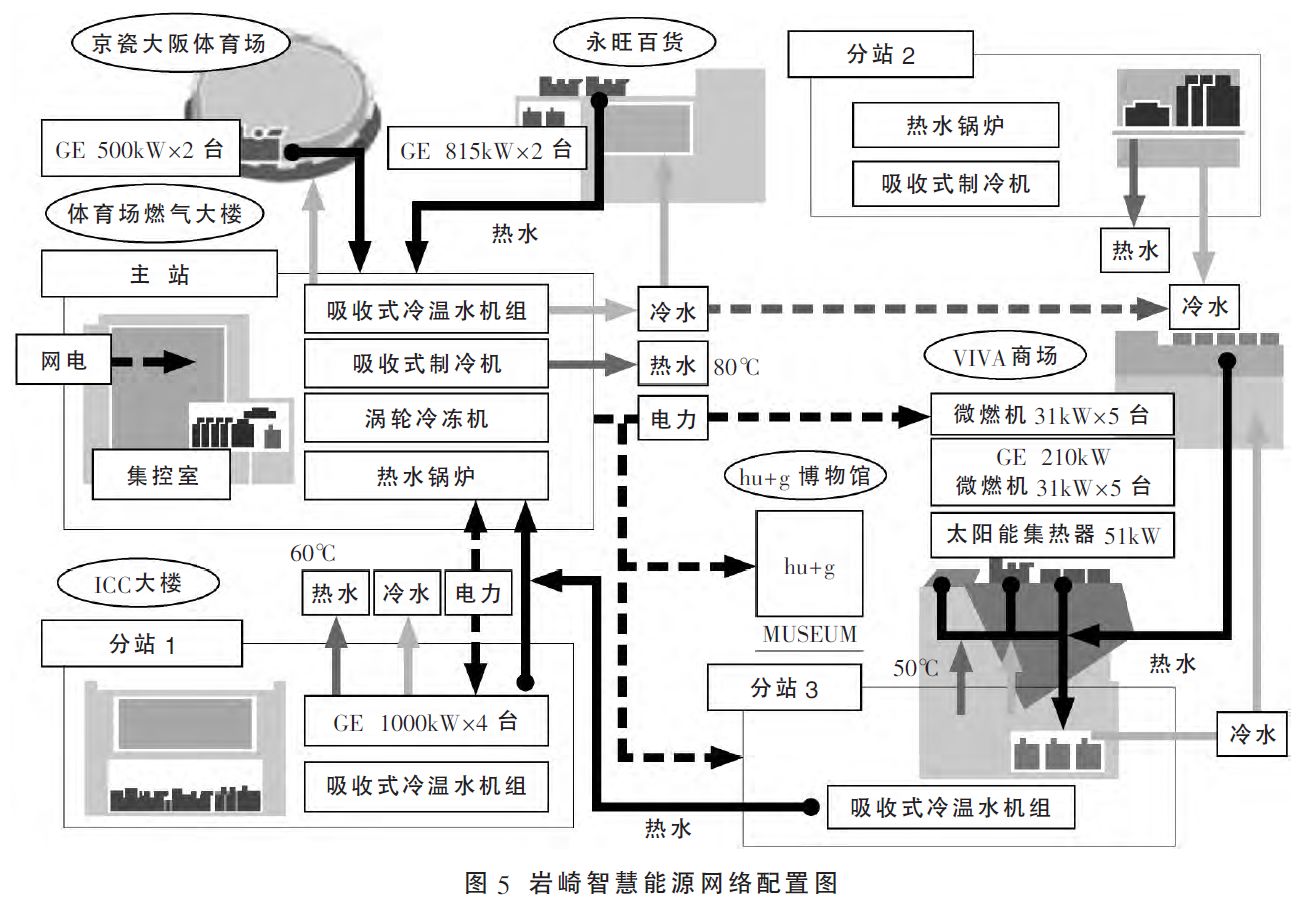永旺百貨配有1630kW的熱電聯(lián)產(chǎn)機組,京瓷體育場配置有1000kW熱電聯(lián)產(chǎn)機組,“hu+g”博物館配有停電對應型熱電聯(lián)產(chǎn)機組(420kW)、SOFC燃料電池(4kW)、太陽能集熱器(120kW)、光伏發(fā)電系統(tǒng)(20kW)和蓄電池(50kW˙h)。區(qū)域內(nèi)建筑用戶與能源站進行電、熱融通,從面域層面構建高效能源利用體系。