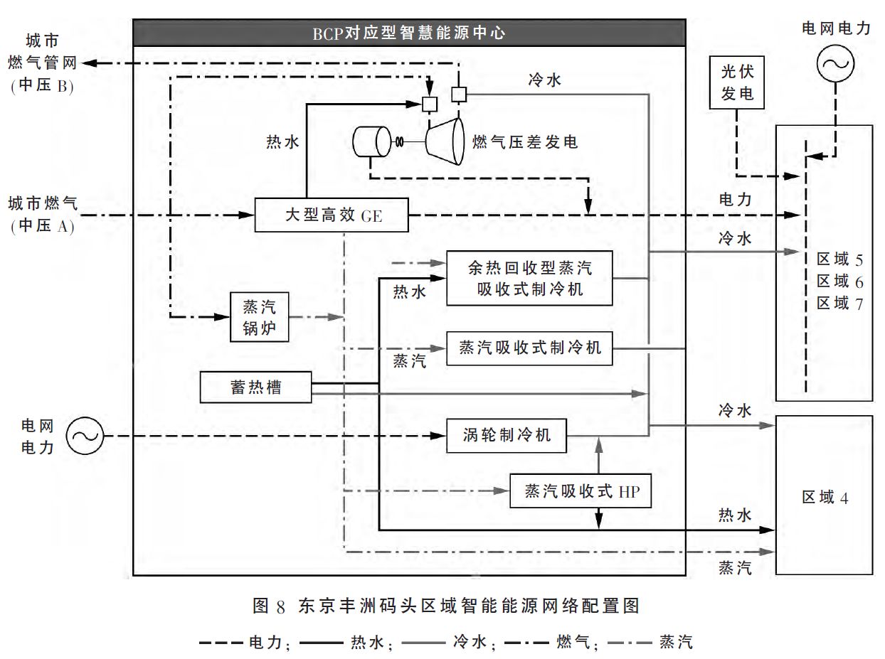 具體而言,能源中心配置有7MW級大型高效燃氣內(nèi)燃機組、利用燃氣壓差的壓差發(fā)電機(560kW)、余熱回收型吸收式制冷機(2000RT)、電動制冷機(4000RT)、蒸汽鍋爐,同時還設置有電力自營線路、強抗災性中壓燃氣管網(wǎng)(見圖8)。