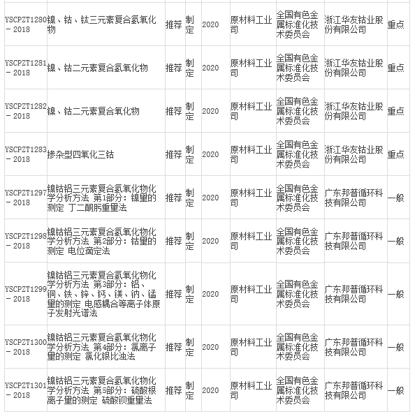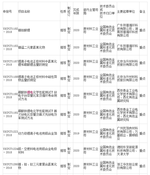 中國儲(chǔ)能網(wǎng)訊:2月1日,工信部公示了2018年第一季度行業(yè)標(biāo)準(zhǔn)制修訂計(jì)劃(征求意見稿),其中在有色行業(yè)標(biāo)準(zhǔn)項(xiàng)目計(jì)劃表中,包含了多項(xiàng)鋰離子電池正極材料及前驅(qū)體相關(guān)標(biāo)準(zhǔn)的制修訂計(jì)劃,共17項(xiàng)(見下表)。