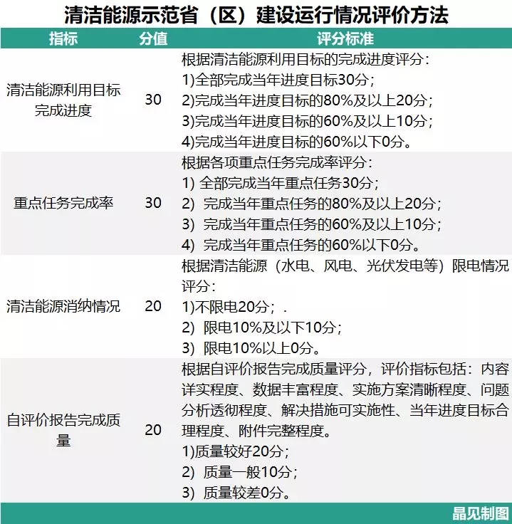 其中,監(jiān)測評價體系分為4個部份,分別為清潔能源利用目標(biāo)完成進(jìn)度、重點任務(wù)完成率、清潔能源消納情況、自評價報告完成質(zhì)量。并且按照以下的評分標(biāo)準(zhǔn),把評價等級分為:較好、一般和較差三個等級。
