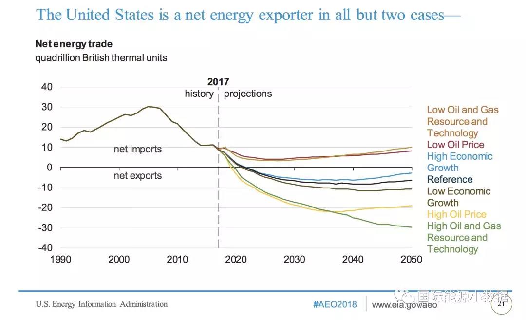 對于到2050年的能源進出口的預(yù)測,EIA設(shè)定了7種不同的情景分析: