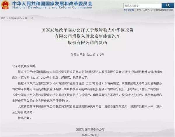 中國儲能網(wǎng)訊:近日,國家發(fā)改委發(fā)布了《關(guān)于戴姆勒大中華區(qū)投資有限公司增資入股北京新能源汽車股份有限公司的復(fù)函》。