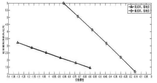 如果把表3用圖表示,可以直觀地看出兩種社會福利凈損失的差異。如圖4所示,高成本、低電價情況下過度消費所產(chǎn)生的社會福利凈缺失明顯大于低成本、高電價情況下抑制生產(chǎn)所產(chǎn)生的社會社會凈損失。這說明在解決交叉補貼的問題上,以社會福利凈損失最小為目標,提高居民電價比降低大工業(yè)和一般工商業(yè)電價更加緊迫。