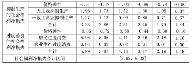 考慮到不同價格彈性估計方法有不同的結(jié)果,本文綜合采用林伯強(2011)、何永秀(2003)和程瑜,張粒子(2003)等估計的電力需求價格彈性的結(jié)果,工業(yè)價格彈性和居民價格彈性區(qū)間分別為[-1.31,-0.60]和[-0.86,-0.16];假設(shè)商業(yè)與工業(yè)彈性一致,農(nóng)業(yè)生產(chǎn)與居民彈性一致。由交叉補貼福利損失模型分析其帶來的社會福利凈損失如表3。