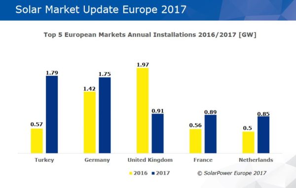2017年德國是歐盟最具活力的太陽能市場,新增了一個1.75吉瓦太陽能發(fā)電量,這代表了23%的增長率,而排名第三的是英國912兆瓦,這個數(shù)據(jù)較之2016年下降了54%,這是因為太陽能補(bǔ)貼計劃進(jìn)一步縮減。