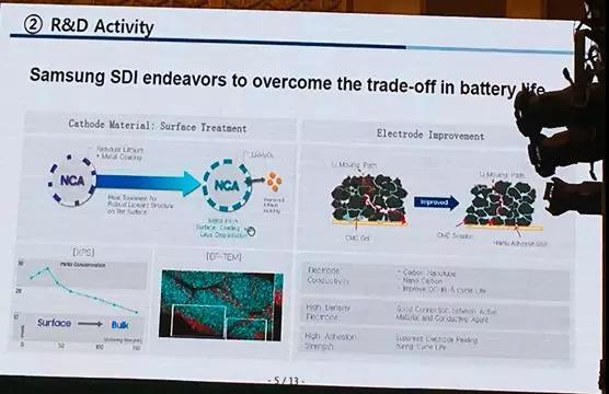在材料工藝方面,三星采用NCA材料,因為鋰離子在循環(huán)往復的使用過程中,容易在NCA表面形成一些殘留,會影響它的使用壽命。三星通過在NCA表面做一層金屬的涂布,減少殘留,提高它的使用壽命。
