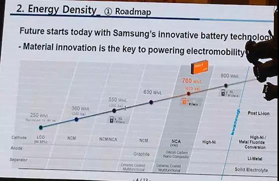 目前,三星的第3代動力電池能量密度是在550wh/L,相當于210—230wh/kg,已經(jīng)實現(xiàn)量產(chǎn)。下一代3.5代產(chǎn)品能量密度可以達到630 wh/L,預計在2019年量產(chǎn)。