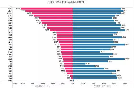 圖1 截至2017年年底分省火電裝機與火電利用小時對比