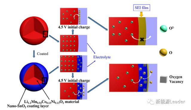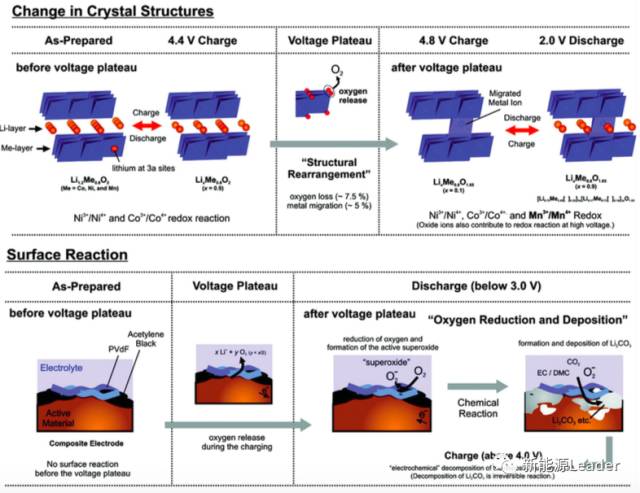 富鋰材料容量高,并且還具有低成本的優(yōu)勢(shì),可以說是非常理想的鋰離子電池正極材料,當(dāng)然任何事情都不可能是完美的,在首次使用的過程中為了發(fā)揮出富鋰材料的高容量,要采用高電壓活化,這一過程中除了形成我們需要的Li2MnO3物相外,也會(huì)生成Li2O,還會(huì)釋放活性氧,這不僅會(huì)破壞富鋰材料自身的結(jié)構(gòu),還會(huì)導(dǎo)致電解液的氧化分解,造成較高的不可逆容量。