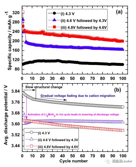 例如他們發(fā)現(xiàn)Li1.17Ni0.25Mn0.58O2在經(jīng)過4.8V活化,并在2.3-4.6V之間循環(huán)的電池,雖然容量高達(dá)242mAh/g,但是循環(huán)性能很差,并且循環(huán)100次后電壓平臺(tái)從3.62V衰降到了3.55V,而經(jīng)過4.6V活化,并在2.3V-4.3V之間循環(huán)的電池,雖然比容量較低僅為160mAh/g,但是循環(huán)性能優(yōu)異,并且循環(huán)100次未出現(xiàn)平臺(tái)電壓衰降,如下圖所示,而沒有經(jīng)過高電壓活化的材料,容量較低僅為100mAh/g左右,可見富鋰材料的活化制度和循環(huán)制度對(duì)于富鋰材料的循環(huán)具有巨大的影響。