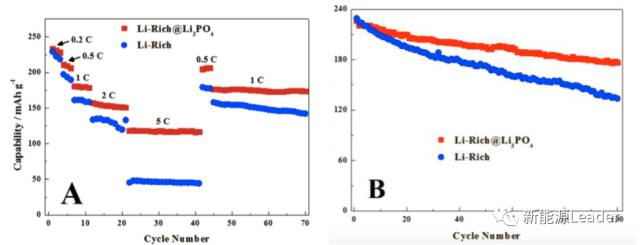 華南師范大學(xué)的Dongrui Chen等[5]借助聚多巴胺模版法,利用Li3PO4對(duì)富鋰材料進(jìn)行了包覆處理,Li3PO4包覆層的厚度僅為5nm左右。Li3PO4包覆層極大的改善了富鋰的材料的循環(huán)性能,0.2C,2.0-4.8V循環(huán)100次,容量保持率為78%,而沒有經(jīng)過包覆處理的富鋰材料容量保持率僅為58%,同時(shí)Li3PO4包覆層也顯著提高了富鋰的材料的倍率性能,如下圖所示。