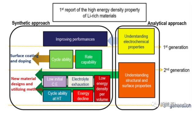 富鋰材料的活化過程對(duì)于富鋰材料的結(jié)構(gòu)穩(wěn)定性有著至關(guān)重要的影響,在活化的過程中會(huì)導(dǎo)致富鋰材料顆粒的表面穩(wěn)定性降低,引起界面副反應(yīng)增加,為此對(duì)于活化制度的研究就顯得尤為重要(下圖為富鋰材料發(fā)展圖解)。