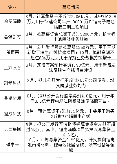 另一方面,已上市的隔膜公司幾乎都進(jìn)行了不同程度的募資,用于強(qiáng)化隔膜業(yè)務(wù),募資金額以億元規(guī)模為主。