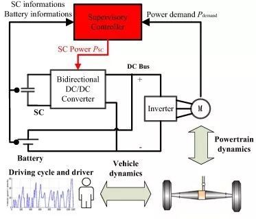 如上圖所示,半主動(dòng)HESS控制系統(tǒng)由幾個(gè)子系統(tǒng)組成:驅(qū)動(dòng)程序、電池組、超級(jí)電容器、DC/DC變換器、電機(jī)、控制器和汽車(chē)底盤(pán)。在能量管理算法中,雙向DC/DC轉(zhuǎn)換器對(duì)直流母線總線進(jìn)行電壓變換,這是我們所在系統(tǒng)的唯一優(yōu)化執(zhí)行器。高優(yōu)先級(jí)控制器負(fù)責(zé)收集超級(jí)電容器、電池和功率鏈的信息,計(jì)算超級(jí)電容器的功率需求,并通過(guò)DC/DC轉(zhuǎn)換器控制超級(jí)電容器的功率?;旌夏茉磧?chǔ)存系統(tǒng)的特點(diǎn)在于電池被動(dòng)地連接到直流母線上,根據(jù)不同的能量鏈儲(chǔ)能放能。而系統(tǒng)中的監(jiān)控器實(shí)現(xiàn)了電池和SC包之間的功率分配。
