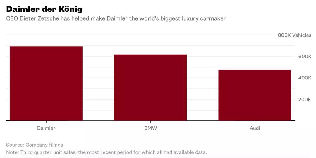 戴姆勒稱王:在首席執(zhí)行官蔡澈的領(lǐng)導下,戴姆勒一舉成為全球最大的豪華車生產(chǎn)商。來源:公司備案(注:第三季度單位銷售量,第三季度是所有數(shù)據(jù)最全的最近一個季度)