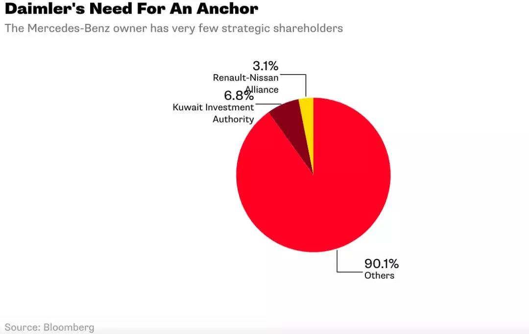 戴姆勒需要穩(wěn)定股東基礎(chǔ)的“定海神針”:戴姆勒公司缺少戰(zhàn)略投資者。來源:彭博社