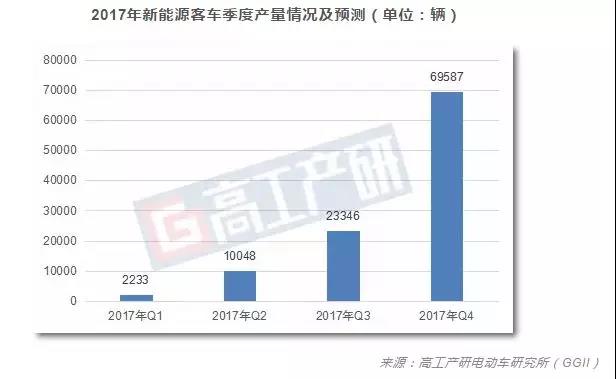 2017年上半年客車市場(chǎng)低迷,但在下半年實(shí)現(xiàn)了大的爆發(fā),尤其是四季度產(chǎn)量達(dá)到69587輛。2018年一季度客車市場(chǎng)依然會(huì)是全年最低迷的一個(gè)季度,但產(chǎn)量會(huì)高于2017年同期,GGII根據(jù)目前市場(chǎng)走勢(shì)來看,預(yù)計(jì)一季度產(chǎn)量會(huì)在1萬輛左右。