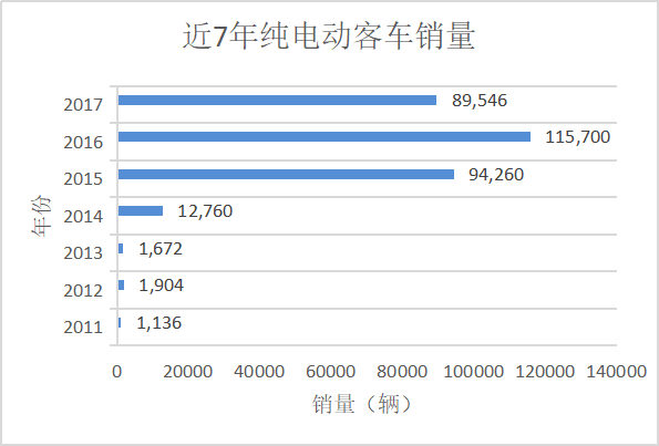 在這種行業(yè)基調(diào)下,純電動(dòng)客車(chē)市場(chǎng)徹底爆發(fā)。從2011年到2016年,純電動(dòng)客車(chē)市場(chǎng)呈現(xiàn)出連增之勢(shì),尤其是2014年和2015年,銷(xiāo)量分別同比增長(zhǎng)6.63倍和6.39倍,而年銷(xiāo)量基數(shù)在不到三年內(nèi)從上千輛提高至十萬(wàn)輛以上,市場(chǎng)火爆程度可見(jiàn)一斑。