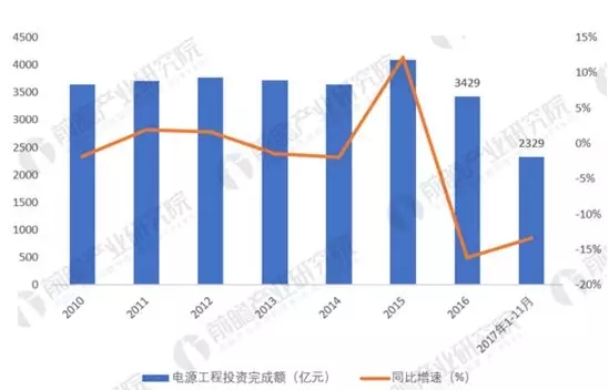 圖表3:2010-2017年全國(guó)電源工程完成投資額情況(單位:億元,%)