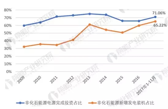 圖表4:2009-2017年非化石能源建設(shè)比重變化趨勢(shì)(單位:%)