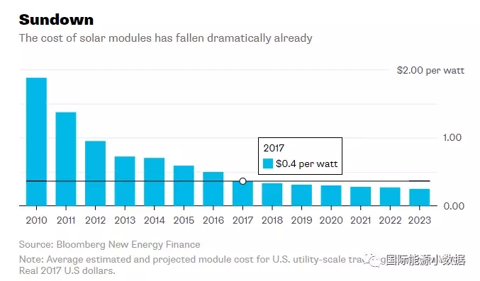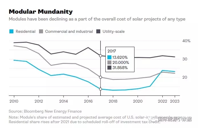 值得注意的是,光伏組件只是光伏系統(tǒng)的一部分。以大型地面光伏電站為例,2010年光伏組件占系統(tǒng)成本的38.8%,而2017年這一比例為31.8%;BNEF預(yù)計(jì)2023年光伏組件將占地面大型光伏電站總成本的31.2%,與2017年相比沒(méi)有明顯變化。對(duì)于屋頂光伏而言,2010年光伏組件占系統(tǒng)成本的29.3%,而2017年這一比例跌至13.6%;BNEF預(yù)計(jì)2023年光伏組件將占屋頂光伏總成本的的23.2%。
