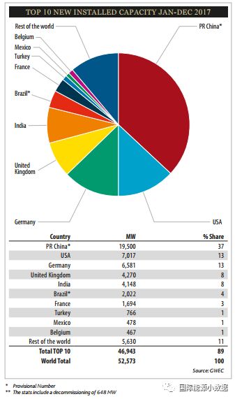 在全球新增裝機(jī)容量中,中國(guó)新增19.50吉瓦(占37.1%)、美國(guó)7.02吉瓦(13.4%)、德國(guó)6.58吉瓦(12.5%)、英國(guó)4.27吉瓦(8.1%)、印度4.15吉瓦(7.9%)、巴西2.20吉瓦(4.2%)、法國(guó)1.69吉瓦(3.2%)、土耳其0.77吉瓦(1.5%)、墨西哥0.48吉瓦(0.9%)、比利時(shí)0.47吉瓦(0.9%)。以上10個(gè)國(guó)家的新增風(fēng)電裝機(jī)46.94吉瓦,占2017年全球新增裝機(jī)89.3%;世界其他國(guó)家新增風(fēng)電裝機(jī)合計(jì)為5.63吉瓦(10.7%)。