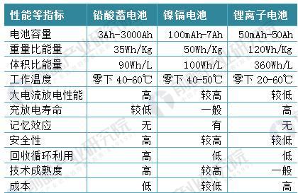 鐵路機(jī)車(chē)用蓄電池產(chǎn)品主要包括鉛酸電池、鎳鎘電池和鋰電池。根據(jù)電池容量、充放電壽命、安全性和技術(shù)成熟度幾個(gè)指標(biāo)對(duì)鐵路機(jī)車(chē)用蓄電池的產(chǎn)品性能進(jìn)行比較分析如下: