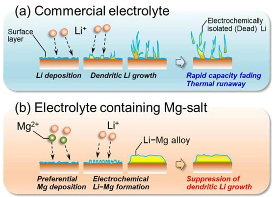 添加鎂鹽抑制鋰晶枝生成的示意圖: