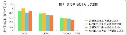 當(dāng)前至2030年,電力需求保持較快增長,且新能源發(fā)電等新技術(shù)仍處于發(fā)展期,電力系統(tǒng)總成本持續(xù)上升。2030~2050年,電力需求增長逐漸趨于飽和,新能源發(fā)電等技術(shù)日益成熟,系統(tǒng)成本進(jìn)入下降期,此階段能源發(fā)展的低碳性目標(biāo)與經(jīng)濟(jì)性目標(biāo)逐漸重合。相比于電力系統(tǒng)總成本,度電平均成本的達(dá)峰時間更早,預(yù)計2050年度電成本約為當(dāng)前水平的一半左右。