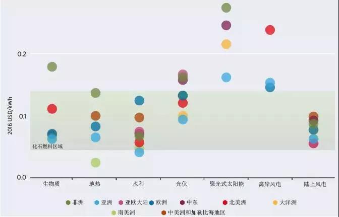 2016-2017年不同地區(qū)、可再生能源技術(shù)平準(zhǔn)化度電成本