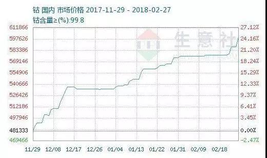 進(jìn)入2018年以后,這種上漲趨勢(shì)仍在持續(xù)。據(jù)生意社商品動(dòng)態(tài),2月27日,國(guó)內(nèi)主要有色金屬現(xiàn)貨市場(chǎng)金屬鈷價(jià)格上漲,鈷報(bào)價(jià)均價(jià)為601666.69元/噸,較上一交易日上漲0.28%。