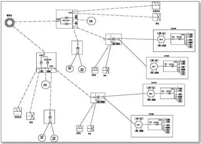 區(qū)域集群式微網(wǎng)采用多級(jí)微電網(wǎng)輻射式架構(gòu)。區(qū)域集群式微網(wǎng)總體架構(gòu)如圖所示:接入系統(tǒng)的變電站(220kV),接入新能源電源、儲(chǔ)能和負(fù)荷構(gòu)成主微電網(wǎng);負(fù)荷中心的變電站(110kV)就地接入新能源電源、儲(chǔ)能和負(fù)荷構(gòu)成一級(jí)子微電網(wǎng);開發(fā)區(qū)等負(fù)荷區(qū)(35kV或10kV)接入分布式電源、儲(chǔ)能和負(fù)荷構(gòu)成二級(jí)子微網(wǎng);終端用戶接入分布式電源、儲(chǔ)能和負(fù)荷構(gòu)成三級(jí)子微網(wǎng)。
