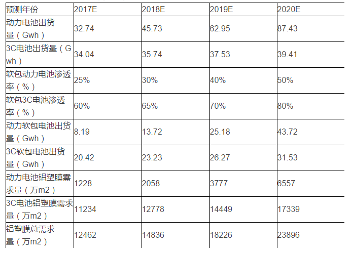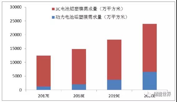 國內(nèi)軟包電池鋁塑膜總需求在2017年約為1.25億平方米,到2020年有望達到2.39億平方米,由于3C電池單位電池容量鋁塑膜用量顯著高于動力電池,故3C電池需求處于較為主導的地位。