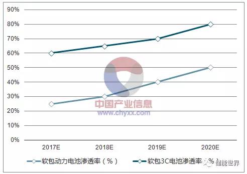 2017-2020年國內(nèi)軟包動力電池、軟包3C電池滲透率量測算