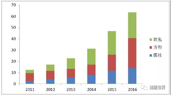 2011-2016年國內(nèi)鋰電池出貨結(jié)構(gòu)