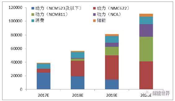國內(nèi)三元材料的總需求量在2017年約為3.9萬噸,到2020年有望達到11.1萬噸,復合增長率為41.72%。其中,動力電池需求市場始終占據(jù)主導地位,且高鎳替代低鎳趨勢明顯。