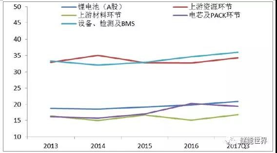 2017年三季報顯示,毛利率最高的是設備、檢測及BMS環(huán)節(jié)以及上游資源環(huán)節(jié),而毛利率始終處于劣勢的為上游材料及電池環(huán)節(jié),考慮這是由于材料環(huán)節(jié)在上游資源的強勢格局及下游車企在退補中的降本訴求對中游環(huán)節(jié)產(chǎn)生了雙重壓迫導致。