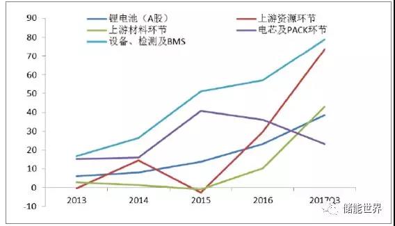 細分子行業(yè)方面,設備環(huán)節(jié)、上游材料環(huán)節(jié)與行業(yè)整體基本保持同一收入增長趨勢,上游資源及電芯環(huán)節(jié)的收入增速和凈利潤增速趨勢則背道而馳,這是因為經(jīng)歷了2015年以來新能源汽車行業(yè)的爆發(fā)式增長后,鋰、鈷等上游資源已明顯呈現(xiàn)供不應求的格局,這一點在上游資源價格的瘋漲上也有所體現(xiàn),相關(guān)公司業(yè)績與股價齊漲。