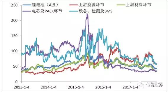 鋰電池行業(yè)及其細分子行業(yè)近五年的估值變化情況(已剔除負值),可見自2015年新能源汽車爆發(fā)式發(fā)展,帶動鋰電池行業(yè)一路猛漲之后,鋰電池行業(yè)整體經(jīng)歷了2016和2017年兩年的緩慢回調(diào),目前估值已基本回歸2013-2014年水平。