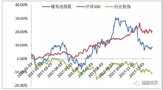 2017年全年,鋰電池指數(shù)累計上漲8.88%,跑輸滬深300指數(shù)11.72個百分點,跑贏創(chuàng)業(yè)板指19.61個百分點。